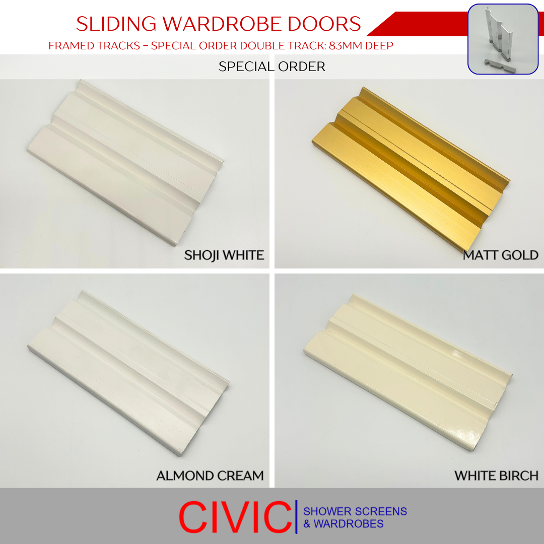 - These track options are for framed and frameless doors, however, slimline doors have their own unique track types to suit the slimmer design. Consider these options carefully to ensure your wardrobe doors glide smoothly and fit perfectly with your space.